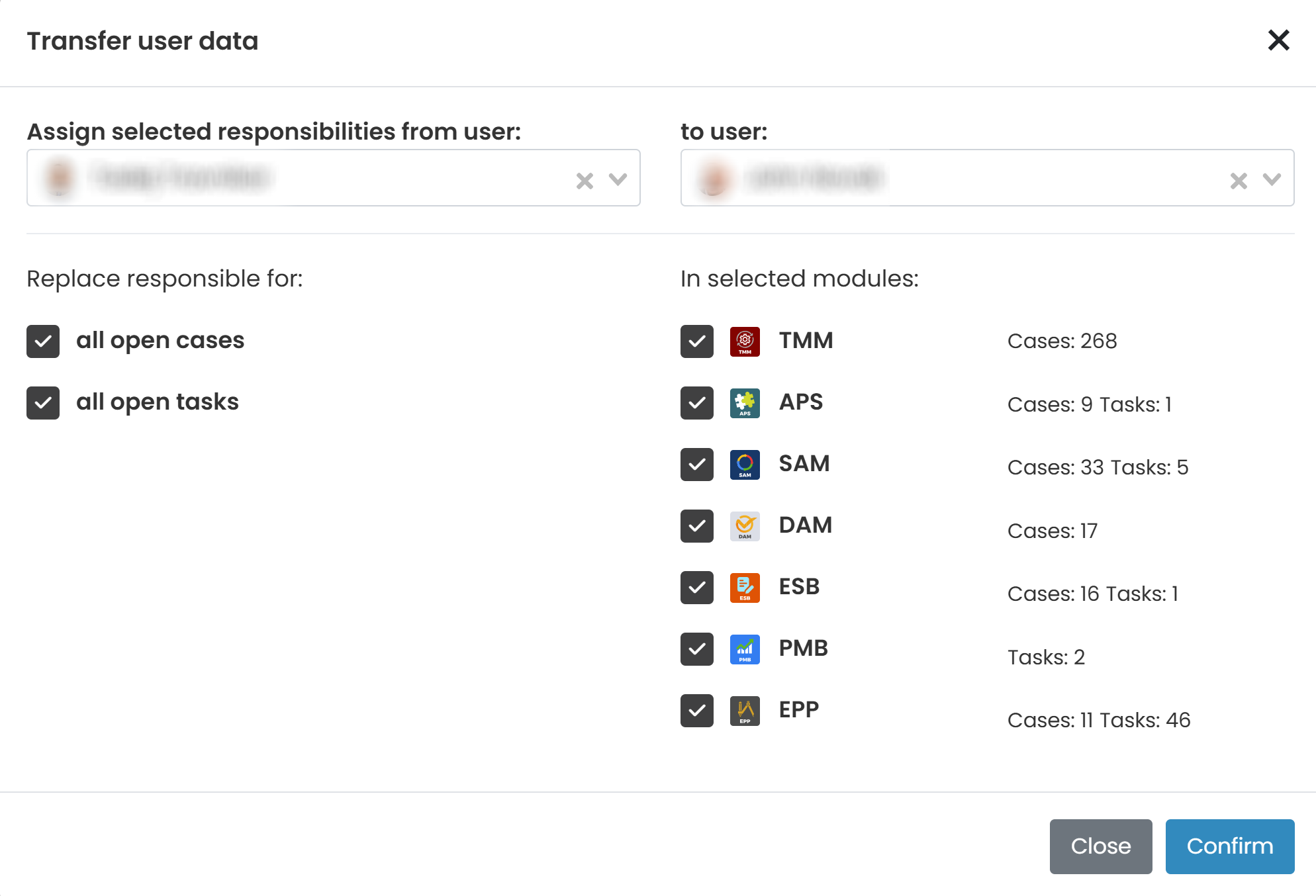 The ability to transfer user data between users or to new users ensures that data is seamlessly migrated, shared, or reassigned as needed. This functionality is particularly useful in scenarios such as role changes, onboarding new users, or transferring ownership of accounts, tasks, or projects.